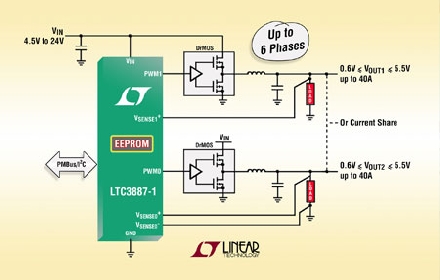 LTC3887-1 調(diào)節(jié)兩個獨立的輸出,也可針對一個 0.5V 至 5.5V 的兩相單路輸出進行配置。最多可交錯和并聯(lián) 6 相以在多個 IC 之間實現(xiàn)準確的均流,從而最大限度地降低高電流或多輸出應(yīng)用的輸入和輸出濾波要求。一個集成的放大器提供了真正的遠端差分輸出電壓檢測,從而可不受電路板 IR 壓降影響以實現(xiàn)高準確度調(diào)節(jié)。應(yīng)用包括電信、數(shù)據(jù)通信、計算和存儲市場所需的大電流 ASIC、FPGA 及處理器電源。