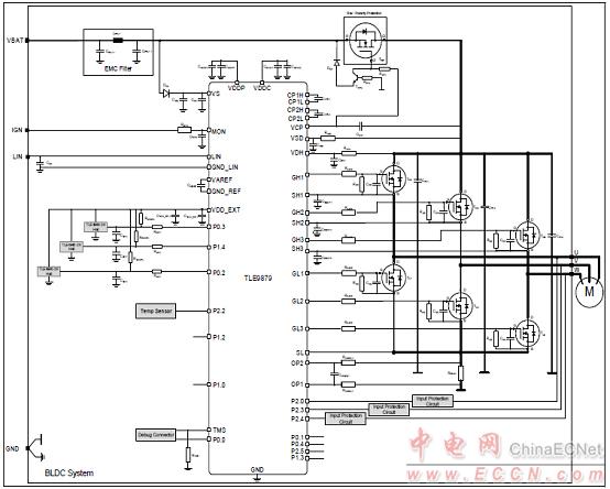 圖2。TLE9879簡(jiǎn)化BLDC驅(qū)動(dòng)器應(yīng)用電路圖