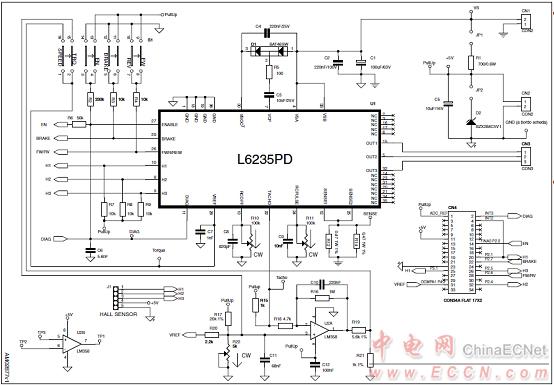 ST公司的L6235是集成了過(guò)流保護(hù)的3相DMOS馬達(dá)驅(qū)動(dòng)器,包括3相DMOS橋,常關(guān)時(shí)間PWM電流控制器和用來(lái)驅(qū)動(dòng)單端霍爾傳感器的譯碼邏輯,工作電壓8-52V,輸出峰值電流5.6A,工作頻率高達(dá)100kHz,具有多種保護(hù)功能.本文介紹了L6235主要特性,框圖,應(yīng)用電路圖和應(yīng)用電路材料清單,三相BLDC馬達(dá)驅(qū)動(dòng)板EVAL6235PD主要特性,電路圖,材料清單和PCB設(shè)計(jì)圖.
