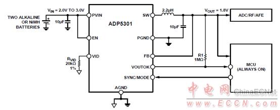 圖2.采用兩節(jié)堿性電池/NiMH電池ADP5301應(yīng)用電路圖