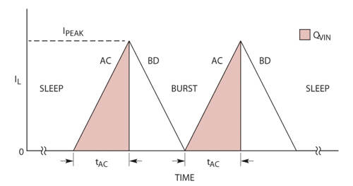 開關(guān) A 和 C 在每個(gè)突發(fā)周期開始時(shí)接通。電感器電流斜坡上升至 Ipeak,然后開關(guān) A 和 C 斷開。接著,開關(guān) B 和 D 接通,直到電感器電流斜坡下降至零為止。這個(gè)周期一直重復(fù),直至 Vout 達(dá)到休眠門限為止。如果 Ipeak 和開關(guān) AC(ON) 時(shí)間 (tAC) 都是已知的,那么 BAT 放電庫侖量 (圖 3 中的陰影區(qū)域) 可以通過對 AC(ON) 周期計(jì)數(shù)并乘以每個(gè) AC(ON) 期間的電荷量來計(jì)算,每個(gè) AC(ON) 期間的電荷量由以下公式給出: