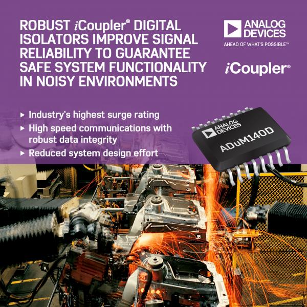 Analog Devices, Inc.,最近推出業(yè)界最魯棒的數(shù)字隔離器系列,是具備信號可靠性、安全性和性能的最佳組合。新型隔離器基于ADI公司的iCoupler®專利數(shù)字隔離技術(shù)。對于工作在高噪聲、惡劣、無法預測的醫(yī)療保健和工業(yè)環(huán)境下的應用,新型隔離器可確保系統(tǒng)安全運行。