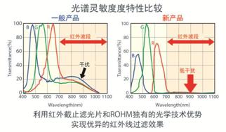 BH1745NUC通過在IC上形成光譜靈敏度特性卓越的濾波器,使傳感器對RGB各波長的干涉更小(圖3)。與一般產(chǎn)品相比,利用優(yōu)異的光譜靈敏度特性,可實現(xiàn)不受光源種類影響的高精度測量(圖4)。