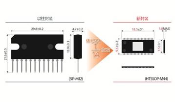 本產(chǎn)品通過采用DC/DC轉(zhuǎn)換器并優(yōu)化電源結(jié)構(gòu),使發(fā)熱量更低,實現(xiàn)了僅PCB板即可散熱的表面貼裝封裝(HTSSOP-A44)。由此,不再需要散熱板,與ROHM以往的產(chǎn)品相比,體積僅為1/14左右,有助于減少組裝工時,并進一步節(jié)省系統(tǒng) 內(nèi)部空間,降低設(shè)計負(fù)擔(dān)。