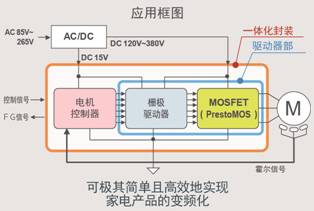 采用一體化封裝,將利用模擬設(shè)計(jì)技術(shù)優(yōu)勢開發(fā)的已取得豐碩業(yè)績的電機(jī)控制器,內(nèi)置于搭載了ROHM獨(dú)創(chuàng)的600V耐壓PrestoMOS的驅(qū)動(dòng)器。因此,可極其簡單地實(shí)現(xiàn)以往只能用2個(gè)封裝實(shí)現(xiàn)的高效正弦波電機(jī)等。與搭載普通MOSFET的風(fēng)扇電機(jī)驅(qū)動(dòng)器(500V耐壓)相比,可最大限度地發(fā)揮PrestoMOS的特性,并成功實(shí)現(xiàn)更高耐壓與更低損耗,在電力基礎(chǔ)設(shè)施不穩(wěn)定的國家和地區(qū)也可放心使用。