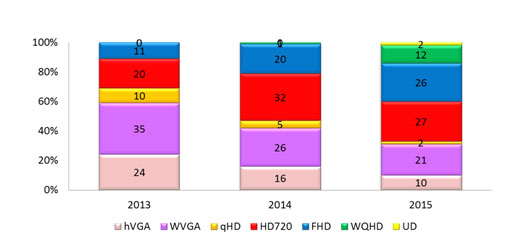 FHD(Full High Definition)即全高清,分辨率可以達(dá)到1920x1080。隨著消費(fèi)者對手機(jī)分辨率的要求不斷提升,一度占據(jù)手機(jī)市場主流的WVGA分辨率逐漸被HD720(1280x720)和FHD取代,手機(jī)屏幕分辨率跨入全高清時代(如上圖)。