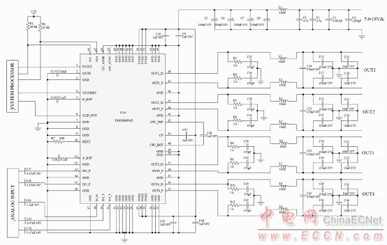 圖2.TAS5404-Q1典型應(yīng)用電路圖