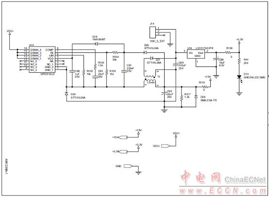 – +15 V, +3.3 V power supply based on VIPER16, L78L33AC, LD1117S33TR.