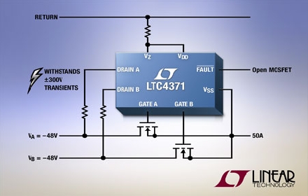 Linear推出堅(jiān)固的理想二極管“或”控制器 LTC4371,該器件適用于雙路饋送大功率電信和數(shù)據(jù)通信電路板。LTC4371 在冗余電源之間提供無(wú)縫切換,用 N 溝道 MOSFET 取代了功率肖特基二極管和相關(guān)的散熱器,從而顯著地減小了功耗、壓差和解決方案尺寸。在閃電引起浪涌、負(fù)載切換或電源短路時(shí),該控制器可承受 ±300V 或更高的瞬變電壓,這是現(xiàn)有最堅(jiān)固的二極管“或”解決方案。一個(gè)具 350µA 低靜態(tài)電流的內(nèi)置分流調(diào)節(jié)電源和高阻抗漏極引腳允許使用電阻值很大的外部電阻器,以在如此高的瞬變電壓時(shí)安全地限制器件電流。由于無(wú)需外部瞬變電壓抑制器,因此可降低成本和減少所需占用的電路板面積。