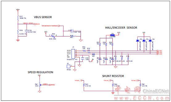圖8.馬達(dá)控制平臺P-NUCLEO-IHM001電路圖:傳感器和并聯(lián)電阻電路