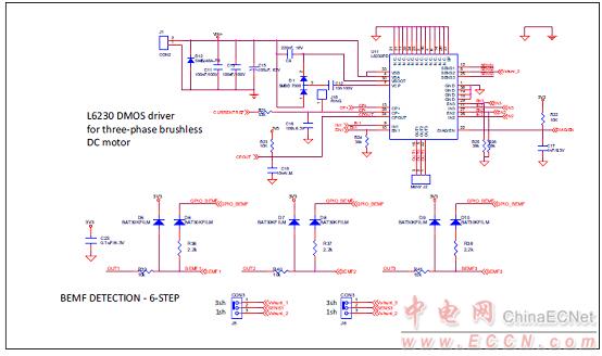 圖9.馬達(dá)控制平臺P-NUCLEO-IHM001電路圖:L6230驅(qū)動器和BEMF檢測電路
