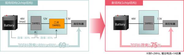 然而,要驅(qū)動(dòng)一般的車載用MCU和控制系統(tǒng),需要可從48V直接降壓到3.3V或5V的高降壓比電源IC,而這種電源IC又不存在,因此只能生成12V等中間電壓通過二段式降壓來解決。而另一方面,為了防止對無線電頻段的影響,又要求2MHz以上的高頻工作。