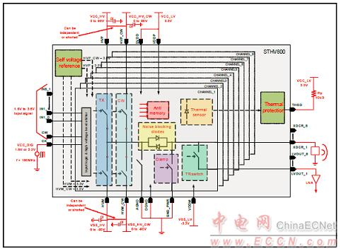 ST公司的STHV800是八路單片高壓高速脈沖發(fā)生器,集成了控制器邏輯接口電路,電平轉(zhuǎn)換器,MOSFET柵極驅(qū)動(dòng)器,噪音抑制二極管,以及大功率P溝和N溝MOSFET輸出級(jí),峰值電流大于2A,輸出電壓0到 ±90 V,工作頻率高達(dá)20MHz,主要用在醫(yī)用超聲圖像,脈沖波形發(fā)生器,NDT超聲發(fā)送器,壓電傳送設(shè)備.本文介紹了STHV800主要特性和框圖,以及基于STHV800的評(píng)估板STEVAL-IME013V1主要特性,硬件框圖,布局圖,兩種超聲波脈沖發(fā)生器解決方案框圖,以及評(píng)估板電路圖和材料清單.