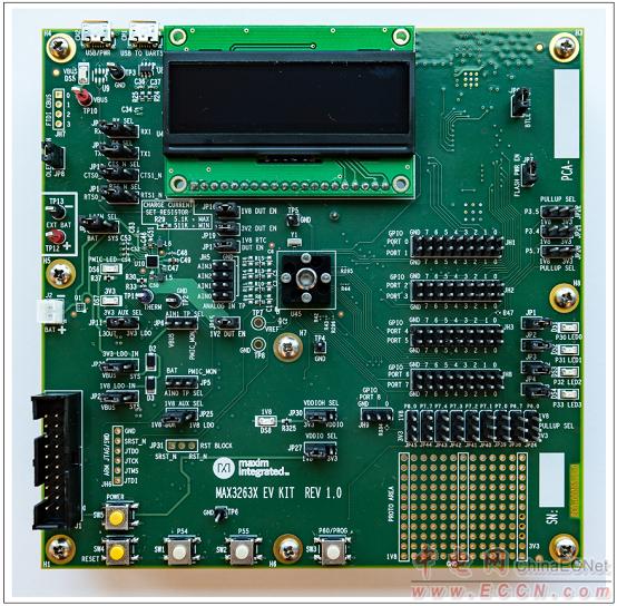 ●● EV kit board with a MAX3263X microcontroller