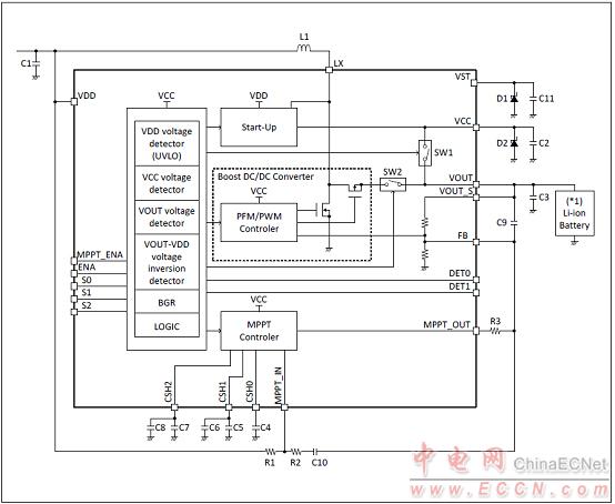 It contains the function to control the DC/DC converter output following the maximum power point of the solar cell (MPPT: Maximum Power Point Tracking) and the protection function to charge the Li-ion battery safely.