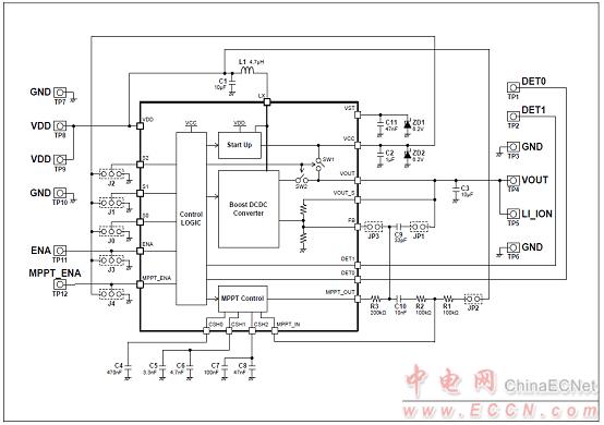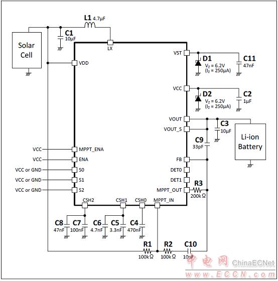 圖3.MB39C831充電模式應(yīng)用電路:MPPT_ENA = H, ENA = H