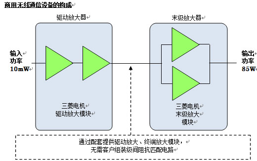 ・通過配套提供驅(qū)動(dòng)放大、末級(jí)放大模塊,無需客戶設(shè)計(jì)組裝級(jí)間阻抗匹配電路,有助于商用無線通信設(shè)備開發(fā)的高效化
