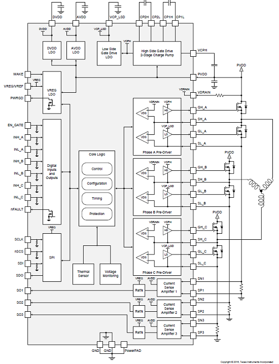 The gate driver uses automatic handshaking when switching to prevent current shoot through. The VDS of both the high-side and low-side MOSFETs is accurately sensed to protect the external MOSFETs from overcurrent conditions. The SPI provides detailed fault reporting, diagnostics, and device configurations such as gain options for the current shunt amplifier, individual MOSFET overcurrent detection, and gate-drive slew-rate control.