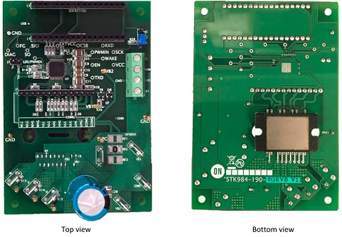 The STK984-190-EGEVB is designed to evaluate the STK984-190E, a MOSFET power module containing 6 MOSFETs in a three-phase bridge (B6) configuration and a seventh MOSFET used as a reverse battery protection switch. The MOSFET module uses a DBC substrate for excellent thermal performance and is suitable for 12 V automotive and industrial applications with motors rated up to 300 W.