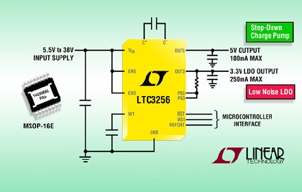 Linear推出高集成度、高壓低噪聲雙輸出電源 LTC3256,該器件采用單一正輸入電壓,無需電感器并以高效率提供 5V 和 3.3V 降壓電源。該器件在很寬的 5.5V 至 38V 輸入電壓范圍內(nèi)工作,包括可獨立地使能的雙輸出:5V 100mA 電源,以及 250mA 3.3V 低壓差 (LDO) 穩(wěn)壓器,總共提供 350mA 可用輸出電流。與雙 LDO 解決方案相比,這些穩(wěn)壓器結(jié)合使用后的功耗會低得多。例如,在 12V VIN 和兩個輸出均為最大負(fù)載情況下,LTC3256 的功耗降低超過 2W,從而顯著減少了熱量和輸入電流。LTC3256 為符合 ISO26262 診斷覆蓋要求的系統(tǒng)而設(shè)計,納入了豐富的安全和系統(tǒng)監(jiān)視功能。該器件非常適合要求采用高壓輸入提供低噪聲、低電源軌的各種應(yīng)用,例如汽車 ECU / CAN 收發(fā)器電源、工業(yè) / 電信內(nèi)務(wù)處理電源、以及通用低功率 12V 至 5V 和 3.3V 轉(zhuǎn)換應(yīng)用。