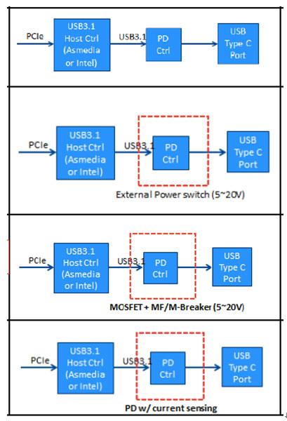 圖2:四種USB Type-C過流保護(hù)方案設(shè)計架構(gòu)