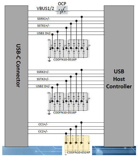 USB Type-C的過壓保護(hù)方面是通過TVS來實(shí)現(xiàn)的。由于USB Type-C正反插無方向的結(jié)構(gòu),其具有上下兩組對稱的接口,每組包括兩組10Gbps高速數(shù)據(jù)收發(fā)通道(SSRX+/SSRX -,SSTX+/SSTX -)、一組兼容以前USB標(biāo)準(zhǔn)的480Mbps數(shù)據(jù)通道(D+/D-)和一組進(jìn)行USB-PD協(xié)議通信的專用通道(CC+/-),所以需要保護(hù)的通道數(shù)量也較以往的USB接口更多,這就需要TVS陣列出場了。為此電路保護(hù)元器件廠商推出了小型化、高集成的方案。比如Bourns的方案, 利用兩個6通道TVS陣CDDFN10-0516P列和一個4 通道TVS陣列CDDFN10-0524P,只需三顆器件就完成了USB Type-C的過壓保護(hù)。