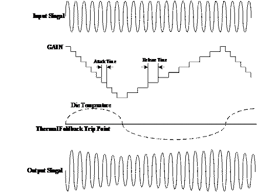 HT862還具有自動(dòng)限溫控制(TFB)功能,在高功率輸出、高環(huán)境溫度等情況下導(dǎo)致芯片片內(nèi)溫度較高時(shí),芯片能自動(dòng)降低系統(tǒng)增益,避免芯片進(jìn)入過溫關(guān)斷保護(hù)模式,在保證音樂品質(zhì)的前提下顯著提升音樂峰值功率,示意圖如下。設(shè)置修改Attack Time和Release Time能適應(yīng)具有不同散熱條件的系統(tǒng)方案。