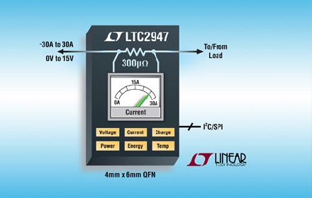 Linear推出針對 0V 至 15V DC 電源軌的功率和能量監(jiān)視器LTC2947。大多數(shù)功率和能量監(jiān)視器 IC 都運用外部檢測電阻器測量電流。然而,選擇檢測電阻器不是一個容易的任務(wù),尤其是在處理大電流時,因為此時所用檢測電阻器可能消耗太多功率、占用大量電路板空間或?qū)y量準確度造成很大影響。LTC2947 集成了一個300µΩ溫度補償檢測電阻器以減輕這些問題,從而為用戶提供一個簡單的24mm2解決方案,以在高達±30A電流提供準確度高達 1.2% 的能量讀數(shù)。當(dāng)測量 30A 滿標度電流時,LTC2947 集成型檢測電阻器的壓降僅為大約 9mV,產(chǎn)生約四分之一瓦功耗,或在測量6A 電壓軌時產(chǎn)生大約 10mW 功耗。除了低功耗,LTC2947 還具備大動態(tài)范圍,因為其失調(diào)僅為非常小的 6mA (或1.8µV)。