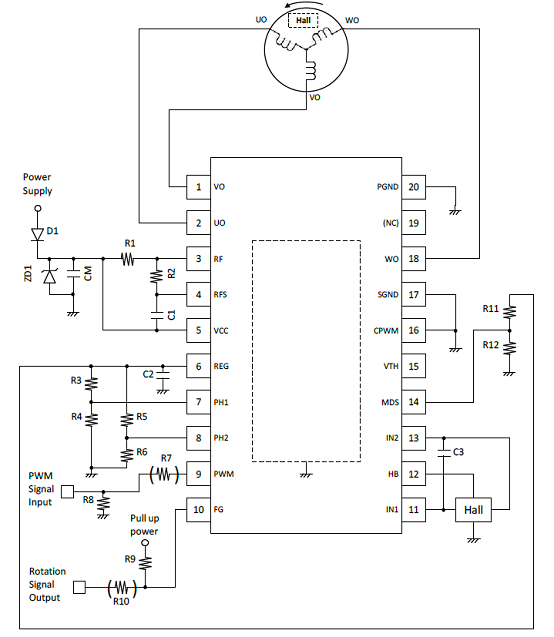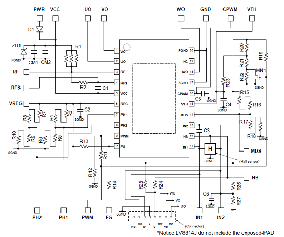 圖3.采用一個(gè)霍爾傳感器的LV8811G/13G三相BLDC馬達(dá)驅(qū)動(dòng)電路圖(2)