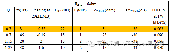 表5 免濾波調(diào)制方式6ohm負(fù)載的LC濾波