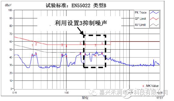 不過(guò)又出現(xiàn)了另外一個(gè)問(wèn)題,圖9顯示振蕩加劇了2MHz~4MHz的頻帶噪聲(如果D類輸出電流增加的話,振蕩會(huì)更加嚴(yán)重)。從理論上講,諧波分量越高,振幅應(yīng)該越小,但是,濾波器的諧振頻率點(diǎn)改變了這一情況。我們看一下圖8.a,與設(shè)置4相比,設(shè)置3在2MHz~5MHz頻帶具有更好的噪聲抑制能力。最終,設(shè)置3在減少振蕩方面表現(xiàn)出最佳的調(diào)優(yōu)效果,并且獲得了較低的邊緣速率,及良好的2MHz~5MHz的EMI裕量。