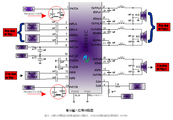 CS8688C內(nèi)置了過流保護(hù),短路保護(hù)和過熱保護(hù),有效的保護(hù)芯片在異常的工作條件下不被損壞。在供電電源小于16.0V的情況下,CS8688C可以驅(qū)動(dòng)一個(gè)4Ω 的低音喇叭和2個(gè)8Ω高音喇叭,整體音頻子系統(tǒng)具有高達(dá)90%的效率,使得在播放音樂的時(shí)候不需要額外的散熱器。