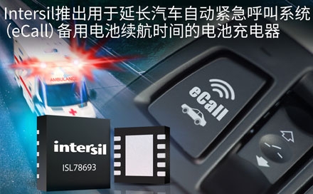 Intersil公司(納斯達克交易代碼:ISIL)今天宣布,推出可延長汽車自動緊急呼叫(eCall)系統(tǒng)中使用的磷酸鐵鋰(LiFePO4)電池續(xù)航時間的3.6V單芯電池充電器---ISL78693。ISL78693電池充電器的漏電流是競爭產(chǎn)品的四分之一(3uA),可延長eCall系統(tǒng)備用電池的供電時間。Intersil將于2017年1月18-20日在日本東京國際汽車技術(shù)展(Automotive World)E30-11號展位展示ISL78693。