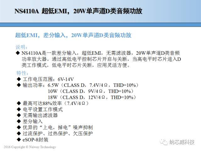 | 納芯威科技全新推出20W單聲道D類音頻功放NS4110A。NS4110A是一款差分輸入,超低EMI,無需濾波器,20W單聲道D類音頻功率放大器。通過高低電平控制芯片開啟與關(guān)斷,當(dāng)高電平時(shí)芯片進(jìn)入D類工作模式,低電平時(shí)芯片關(guān)斷,應(yīng)用靈活方便。NS4110A 采用先進(jìn)的技術(shù),在全帶寬范圍內(nèi)極大地降低了 EMI 干擾,最大限度地減少了對其他外部元件的影響。其輸出無需濾波器的 PWM 調(diào)制結(jié)構(gòu)減少了外部元件、PCB面積和系統(tǒng)成本。NS4110A在12V的工作電壓時(shí),能夠向4Ω負(fù)載提供高達(dá)18W的輸出功率,88%以上的效率更加適合便攜式音頻系統(tǒng)。