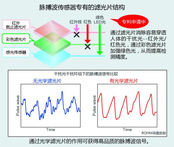 “BH1790GLC”利用ROHM的傳感器技術(shù)優(yōu)勢,采用非常適合脈搏檢測的符合綠色光波長的光電二極管,同時感光部采用綠色光的濾光片和紅外(IR)截止濾光片相結(jié)合的脈搏傳感器專有的濾光片結(jié)構(gòu)。因此,