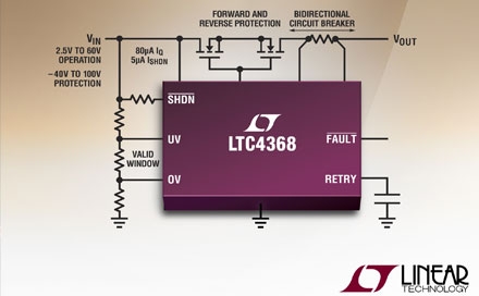 Linear推出電路保護(hù)控制器 LTC4368,在電池供電式汽車、工業(yè)和便攜式系統(tǒng)中,該器件可針對 2.5V 至 60V 電子線路確保安全的電壓和電流水平。LTC4368 能替代熔斷器、瞬態(tài)電壓抑制器和分立電路,從而實現(xiàn)一種用于避免電子線路遭受有害的過流以及過壓、欠壓和反向電壓狀況之損壞的緊湊和全面型解決方案。LTC4368 控制背對背 N 溝道 MOSFET 以在正常操作期間提供一條低損耗電流通路,當(dāng)發(fā)生正向或反向過流故障時則把它們關(guān)斷。LTC4368-1 電路斷路器提供對稱的正向和反向電流門限,以保護(hù)電池免遭過大的充電和放電電流的損壞。LTC4368-2 電路斷路器在檢測到反向電流時跳變,以防止反向饋電并保持輸出。