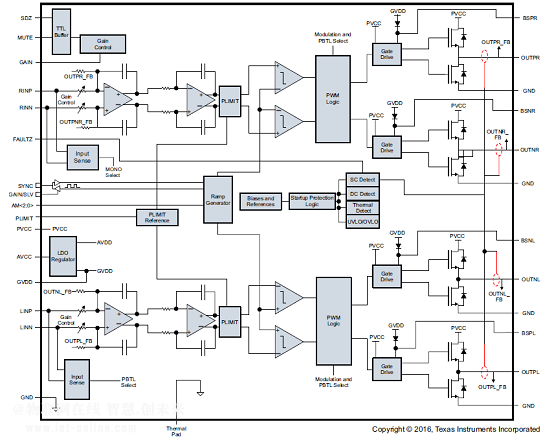圖2. TPA3128D2簡(jiǎn)化應(yīng)用電路圖