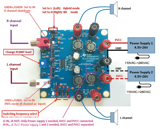 圖5.評(píng)估模塊TPA3128D2 EVM連接示意圖