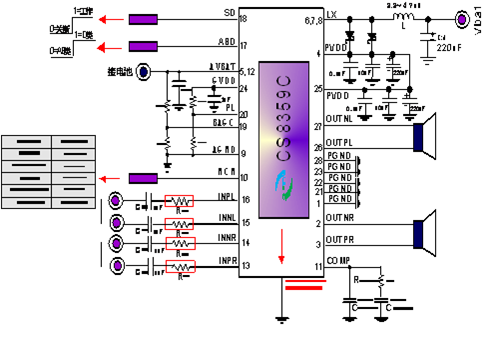 CS8359C的PVDD實際為升壓電源的輸出,也是內(nèi)置功放模塊的電源輸入。因此濾波去耦電容是必須的。我們要求使用兩組電容,一組是0.1uF和10uF組成的去耦電容,一組是470uF的濾波電解電容。0.1uF和10uF的貼片電容要盡可能的靠近芯片管腳放置。220uF的濾波電容也是必須的(建議使用高頻低阻系列的電解電容,可以有效的提高效率,減少電壓紋波),過小的電容會使BOOST模塊的輸出電壓震蕩。PVDD端電容對于CS8359C的性能影響很大,具體可參考PCB設(shè)計指南,或與原廠工程師聯(lián)系。