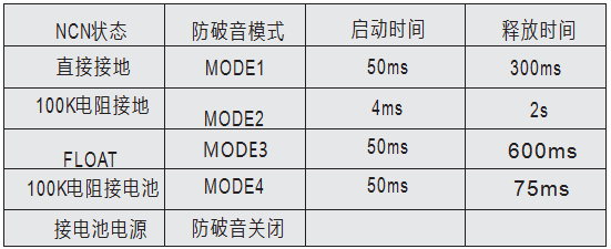 在音頻應(yīng)用中,輸入信號過大或者電池電壓下降等因素都會導(dǎo)致音頻功放的輸出信號發(fā)生破音失真,而且過載的信號會對揚聲器造成永久性損傷。CS8359C獨特的無破音(NCN)功能可以通過檢測放大器輸出信號的破音失真,自動調(diào)整系統(tǒng)增益,使得輸出音頻信號保持圓潤平滑,不僅有效地避免了大功率過載輸出對喇叭的損 壞,同時帶來更舒 適的聽覺享受。CS8359C提供四種NCN工作模式和不防破音模式可供用戶選擇 :M1,M2,M3,M4,NCNOFF,可以通過設(shè)置NCN引腳的不同狀態(tài)來分別進(jìn)入五種模式。啟動時間(Attack Time): 從發(fā)生破音失真到系統(tǒng)自動增益調(diào)節(jié)完成的時間間隔。釋放時間(Release Time):從破音失真消失到系統(tǒng)完全退出增益衰減狀態(tài)的時間間隔。通過NCN管腳狀態(tài)設(shè)置M1,M2,M3,M4,NCNOFF模式的啟動時間和釋放時間如下表所示。