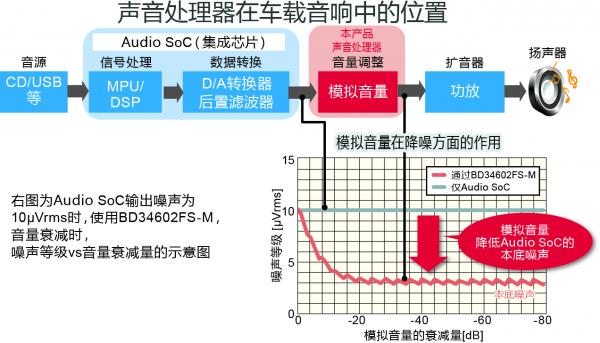 另一方面,音響用SoC*4)作為車載音響的核心,隨著制造工藝的微細(xì)化發(fā)展而呈現(xiàn)低電壓趨勢,可處理的音頻信號(hào)變小,本底噪聲相對增加。這個(gè)課題的解決方法要求在SoC的后段具備低噪聲且高音質(zhì)的模擬音量。