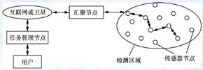 大量傳感器節(jié)點(diǎn)隨機(jī)部署在監(jiān)測(cè)區(qū)域內(nèi)部或附近,能夠通過(guò)自組織方式構(gòu)成網(wǎng)絡(luò)。傳感器節(jié)點(diǎn)檢測(cè)的數(shù)據(jù)沿著其他傳感器節(jié)點(diǎn)逐條地進(jìn)行傳輸,在傳輸過(guò)程中檢測(cè)數(shù)據(jù)可能被多個(gè)節(jié)點(diǎn)處理,經(jīng)過(guò)多跳后路由到匯聚節(jié)點(diǎn),最后通過(guò)互聯(lián)網(wǎng)或衛(wèi)星到達(dá)管理節(jié)點(diǎn)。用戶通過(guò)管理節(jié)點(diǎn)對(duì)傳感器網(wǎng)絡(luò)進(jìn)行配置和管理,發(fā)布監(jiān)測(cè)數(shù)據(jù)。