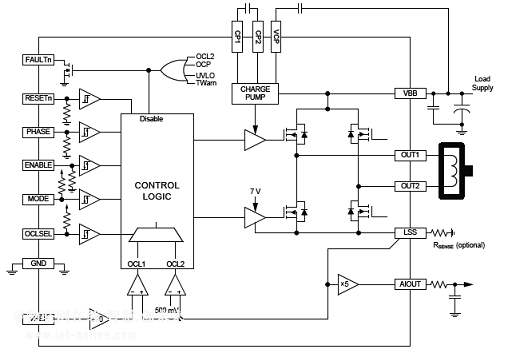 Internal circuit protection includes overcurrent protection,motor lead short to ground or supply, thermal shutdown withhysteresis, undervoltage monitoring of VBB, and crossovercurrentprotection.
