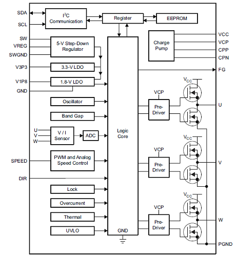 The DRV10983-Q1 device uses a proprietary sensorless control scheme to provide continuous sinusoidal drive,which significantly reduces the pure tone acoustics that typically occur as a result of commutation. The interfaceto the device is designed to be simple and flexible. The motor can be controlled directly through PWM, analog, orI2C inputs. Motor speed feedback is available through both the FG pin and the I2C interface simultaneously.