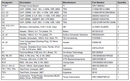 評(píng)估模塊DRV10983-Q1 EVM材料清單:
