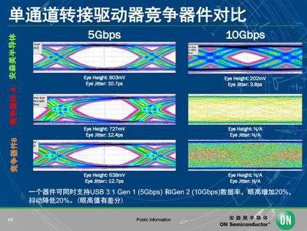 在安森美半導(dǎo)體的完整方案中,有這樣一個(gè)器件叫“轉(zhuǎn)接驅(qū)動器”,這個(gè)器件究竟起到了什么作用呢?李先生說到,在數(shù)據(jù)傳輸方面,USB Type-C可以取代通用接口如VGA、HDMI等不同標(biāo)準(zhǔn),在USB3.0和Type C環(huán)境下傳輸速率可達(dá)到5Gbps或10Gbps,這便需要用到轉(zhuǎn)接驅(qū)動器來減少碼間串?dāng)_,防止不想要的信號失真而影響傳輸,以符合USB3.0X眼圖高度和總抖動規(guī)范。相比市場上其它同類產(chǎn)品,安森美半導(dǎo)體一個(gè)器件可同時(shí)支持USB3.15Gbps和10Gbps的數(shù)據(jù)率,眼高增加20%,抖動降低20%。而其它方案僅支持5Gbps,且眼高和抖動方面都不及安森美半導(dǎo)體。另外,USB線纜越長,信號會越弱,在線里增加轉(zhuǎn)接驅(qū)動器后,可用來增強(qiáng)信號的性能。換句話說,線纜長度和性能將推動對轉(zhuǎn)接驅(qū)動器和高質(zhì)量互聯(lián)的需求。