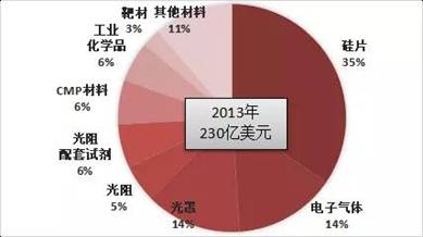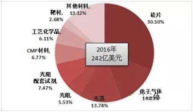 半導體晶圓制造材料和晶圓制造產(chǎn)能密不可分,近年隨著出貨片數(shù)成長,半導體制造材料營收也由2013年230億美元成長到2016年的242億美元,年復合成長率約1.8%。從細項中可看出硅晶圓銷售占比由2013年35%降到2016年的30%。
