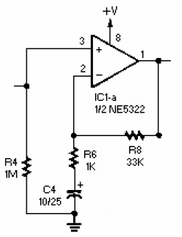 預(yù)放大電路是一個(gè)運(yùn)放電路,并不對音頻做反向處理,看起來像預(yù)放大。這個(gè)電路是必須的,因?yàn)檫@個(gè)噪音的音頻信號(hào)從麥克風(fēng)過來之后非常微弱,必須經(jīng)過放大,才可以使用。預(yù)放大的增益由R8和R6的比值決定,通過改變這兩個(gè)電阻值可以控制音頻信號(hào)的幅度,這個(gè)信號(hào)將被送入相位反轉(zhuǎn)電路。