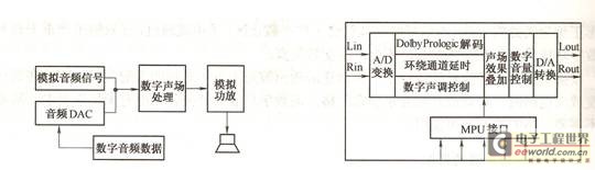 所謂的“數(shù)字化”功放只是在前置級上采用數(shù)字信號處理的方式,在模擬音頻信號或數(shù)字音頻信號輸入后,采用現(xiàn)有的數(shù)字音頻處理集成電路,實(shí)現(xiàn)一些比如聲場處理、數(shù)字延時、混響等功能,最后再通過模擬功率放大模塊進(jìn)行音頻放大。其典型電路框圖如圖2所示。由圖2可知,其各模塊的接口都是采用模擬方式。而數(shù)字聲場處理模塊的大致原理框圖如圖3所示。{{分頁}}