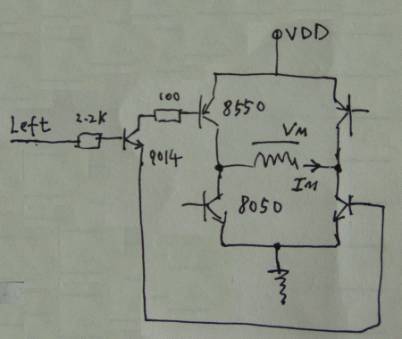 以上電路不但簡單便宜,而且效率很高。8550+8050的橋在5V供電,驅(qū)動(dòng)100mA左右的小電機(jī)時(shí),橋上的壓降小于0.5V。D772+D882的橋在7.2V供電,200-300mA的電流下,壓降不到1V。